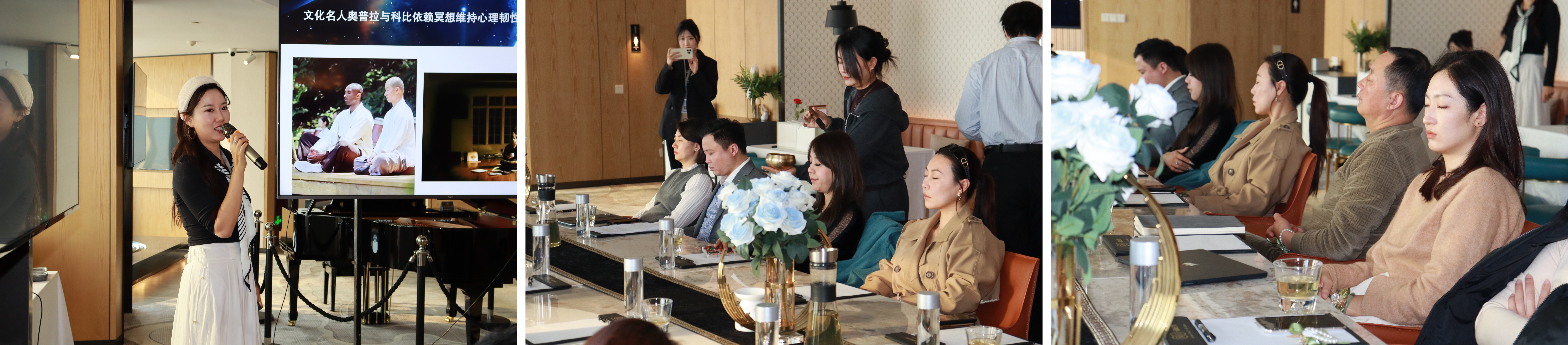 活动伊始,润信家族办公室市场总监余韵(中国管理科学学会高级冥想疗愈师)为大家介绍了冥想的益处,及身体脉络的相关知识。随后灯光调暗,所有宾客缓缓闭上眼睛,冥想体验正式开始。伴随着冥想音乐与颂钵声在耳边萦绕,自然均匀地呼吸,放松身体,通过冥想疗愈纷扰与压力。余韵强调:“人最稀缺的不是资产,而是稳定的生命能量值。能量频率对了,财富才会跟随。”。